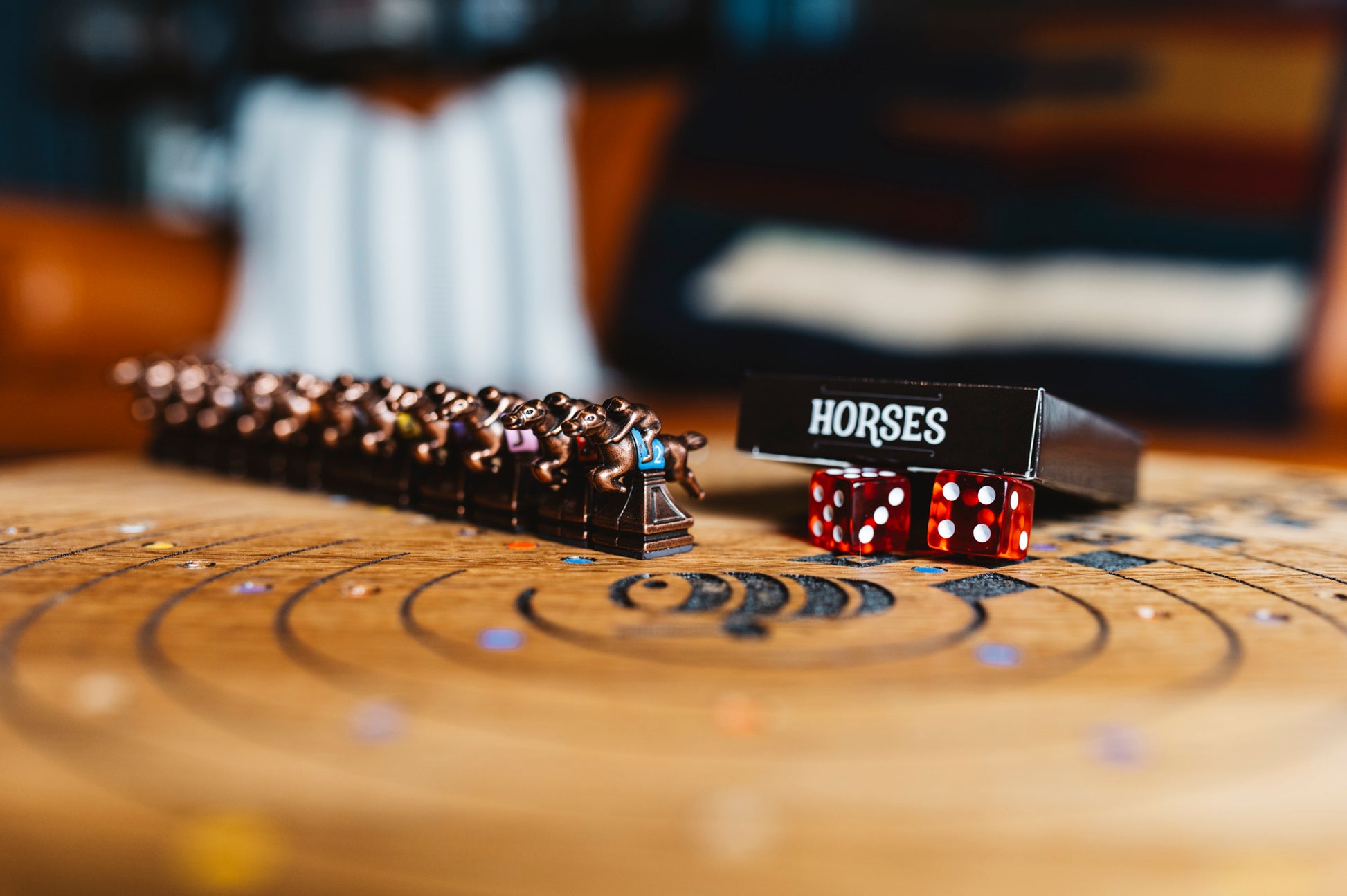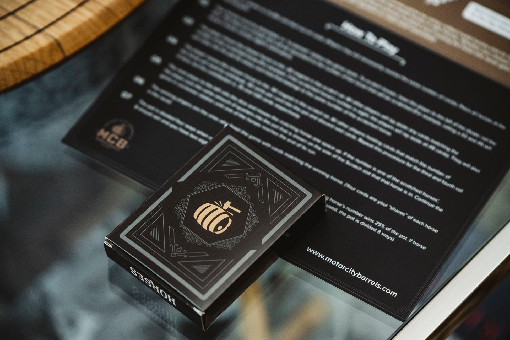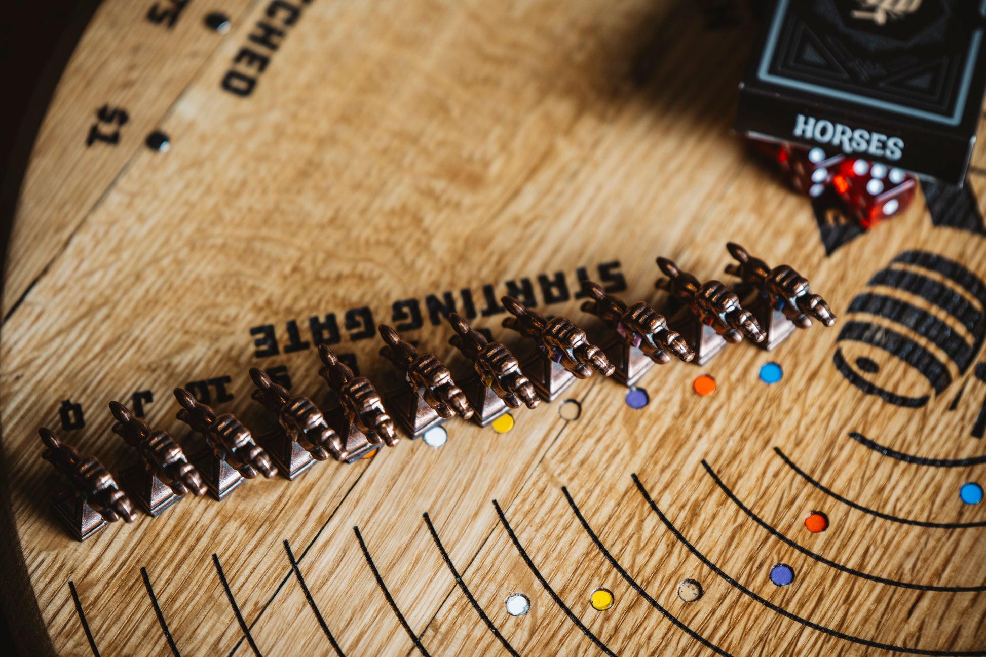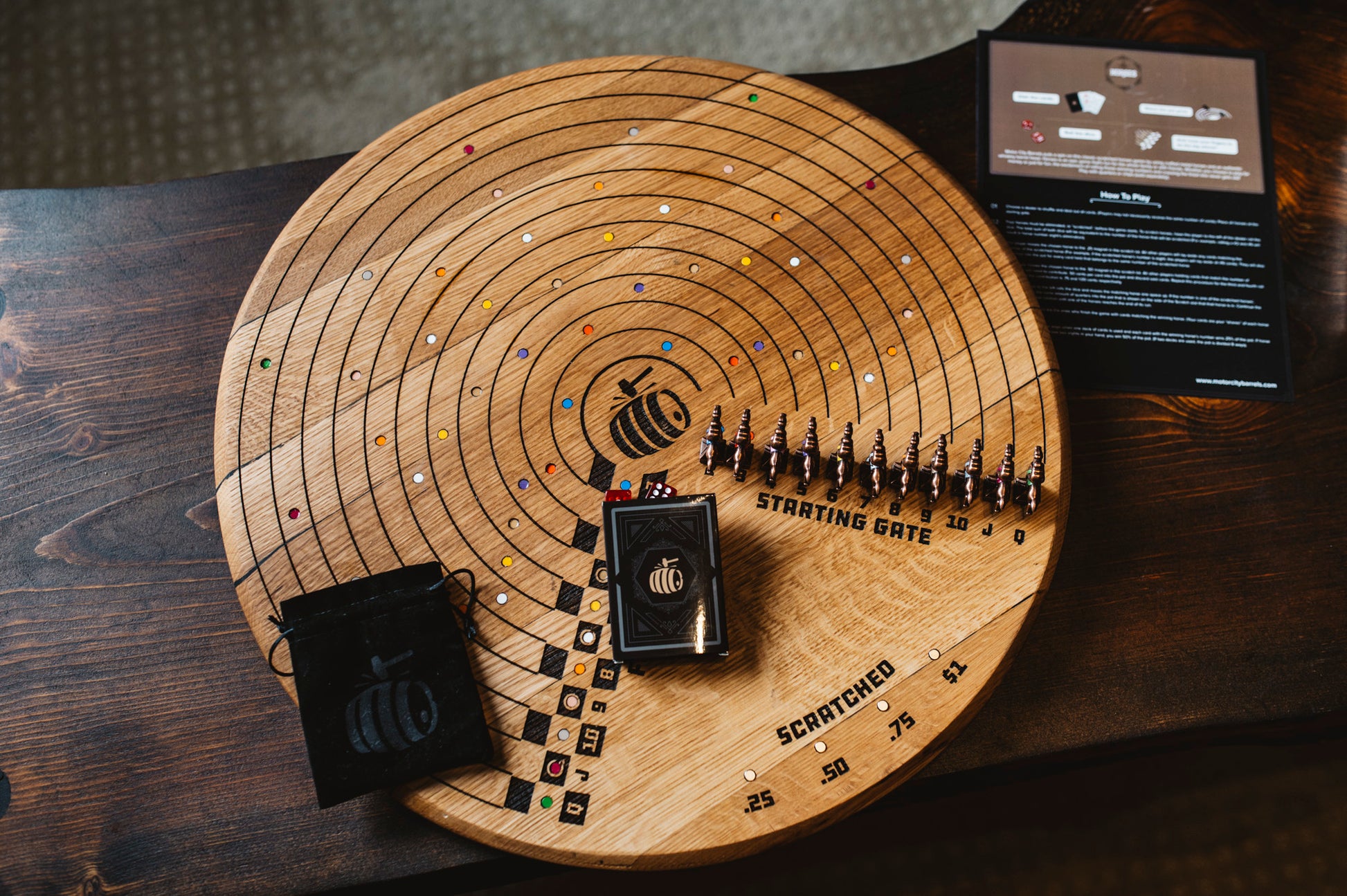 Motor City Barrels puts a spin on this classic Scratched Horses game by using crafted metal horses and an authentic whiskey barrel head. Horses is an epic game that is fun for everyone! Whether you choose to play for money or simply for the fun of it, the excitement of rolling those winning numbers and crossing the finish line never gets old! Play with quarters or chips (sold separately).
