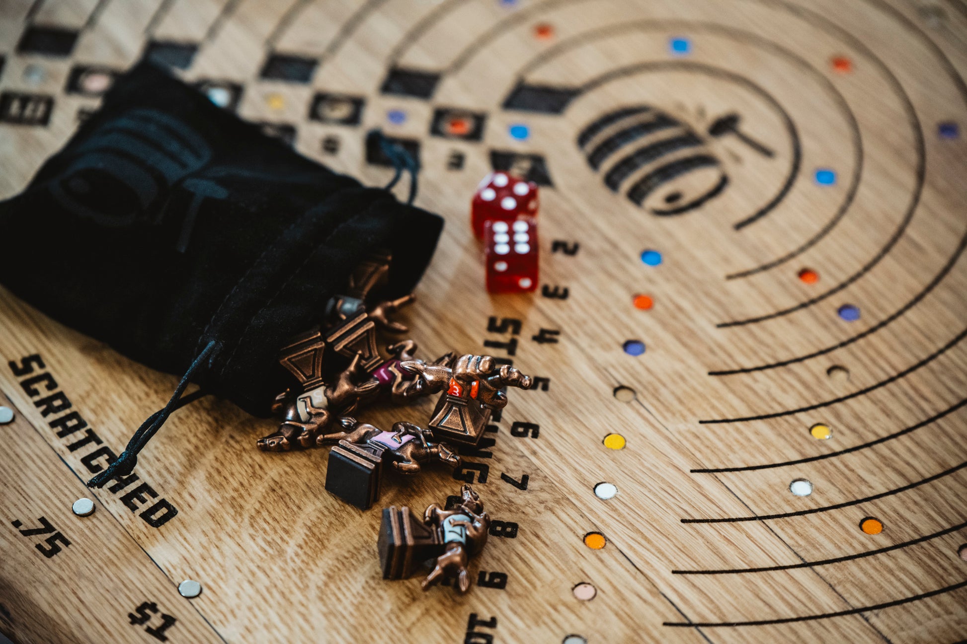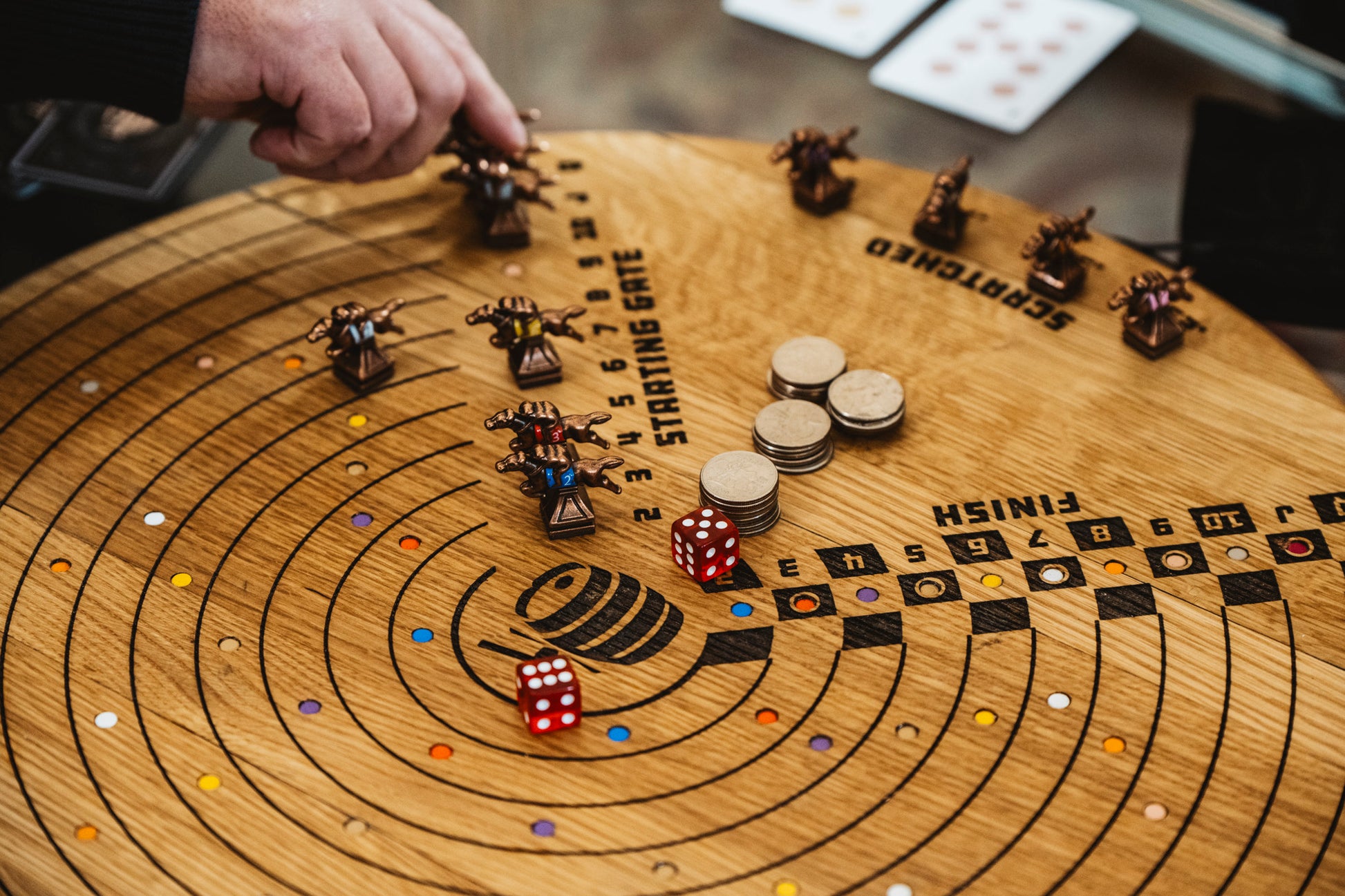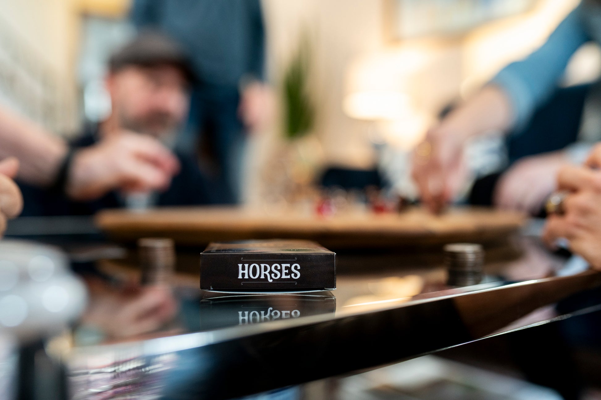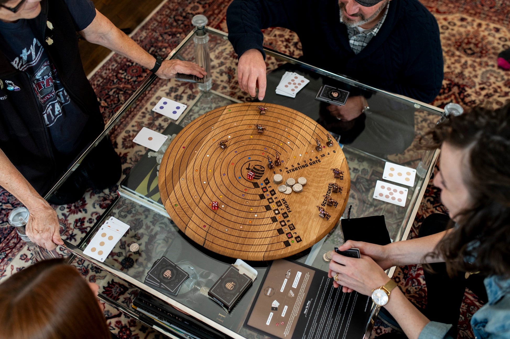 Motor City Barrels puts a spin on this classic Scratched Horses game by using crafted metal horses and an authentic whiskey barrel head. Horses is an epic game that is fun for everyone! Whether you choose to play for money or simply for the fun of it, the excitement of rolling those winning numbers and crossing the finish line never gets old! Play with quarters or chips (sold separately).